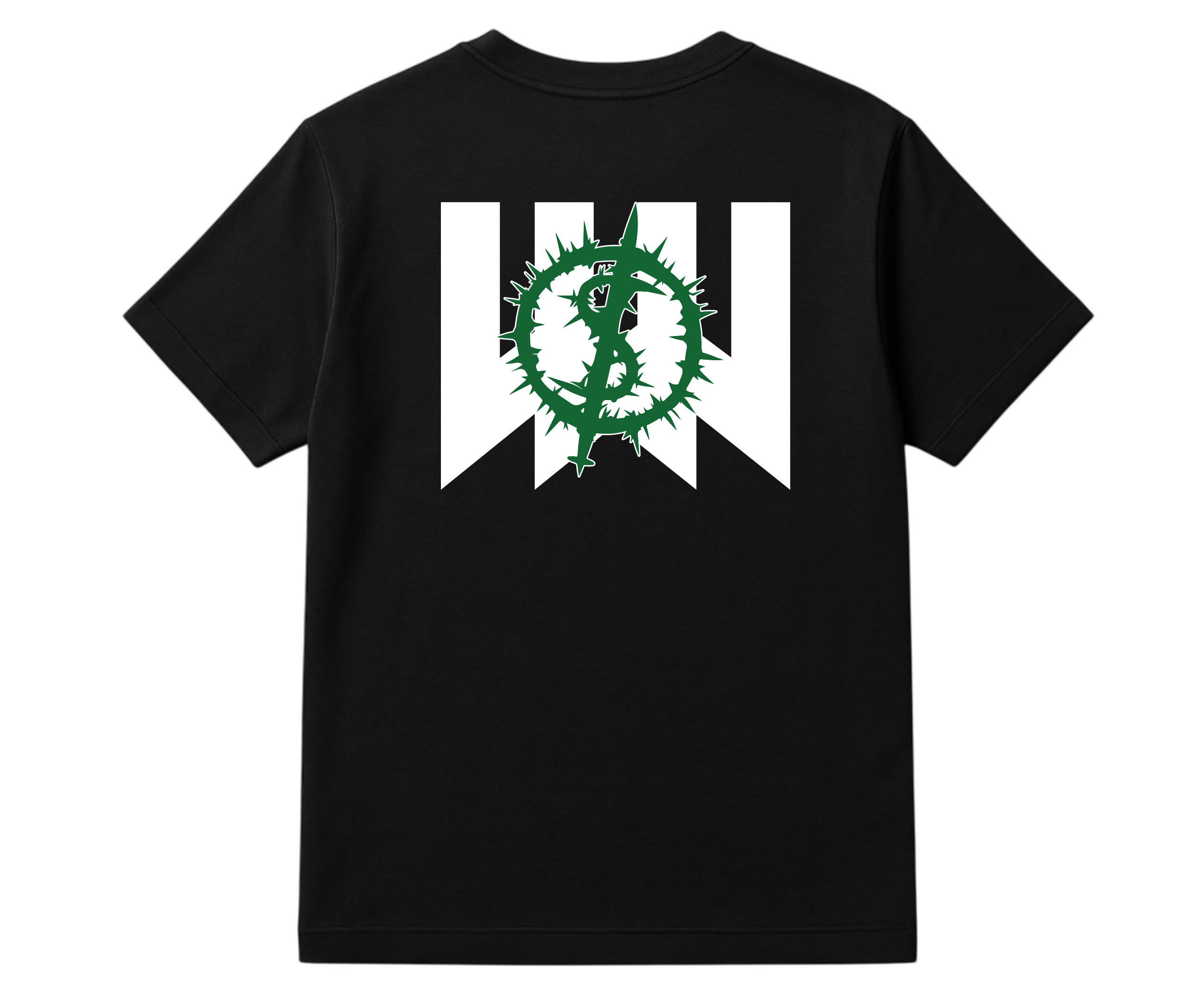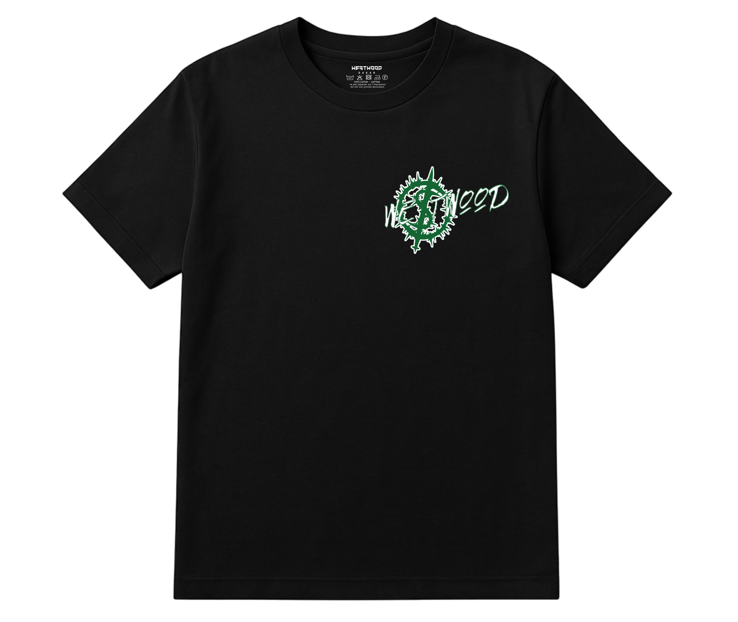 Face avant : Logo « Westwood » stylisé en lettrage blanc dynamique, superposé sur l’emblème circulaire épineux emblématique en vert. Un marquage discret mais puissant sur la poitrine.